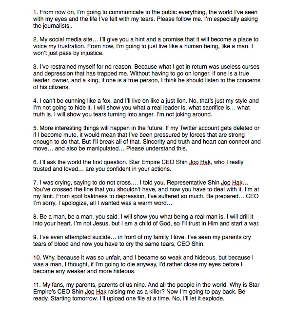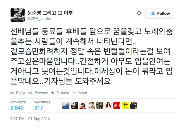 Portal sites, I’m so disappointed. Don’t take down the searched terms and please keep up ‘Moon Junyoung,’ ‘ZE:A,’ ‘Star Empire Mistreatment,’ ‘CEO Shin Joo Hak truth,’ so the public will know. If you have sons like me, please do it. We can’t have another victim… If you act like this, I’m going to reveal my first round.