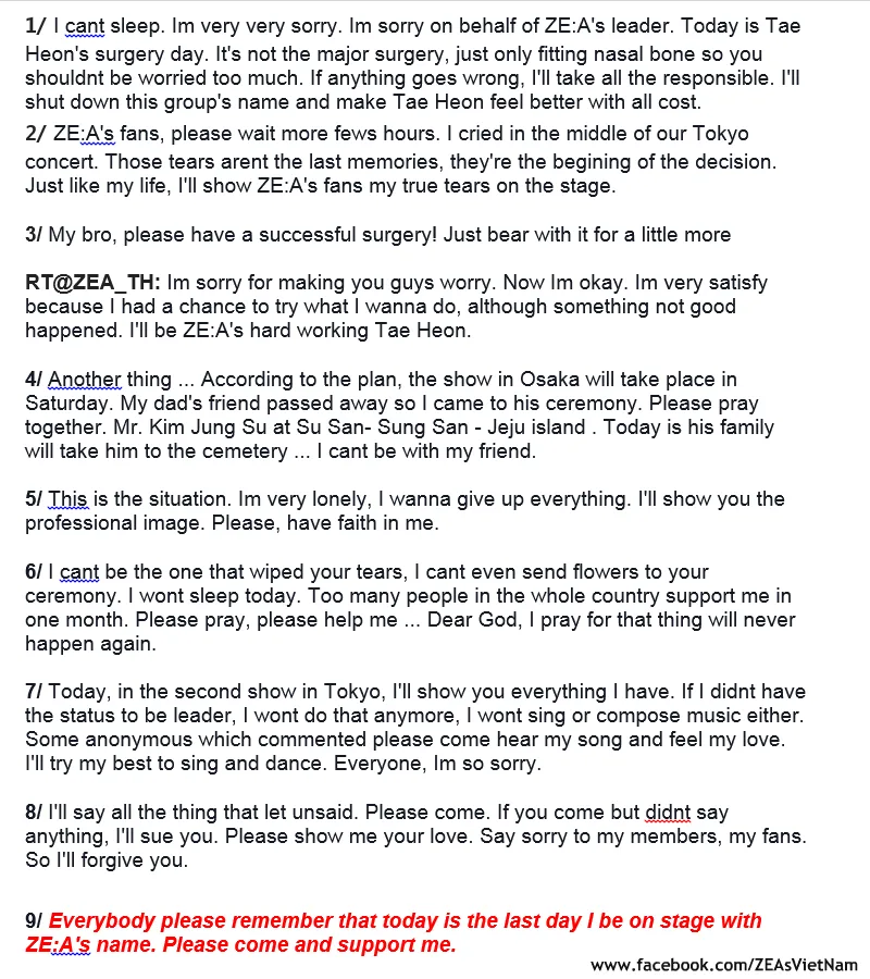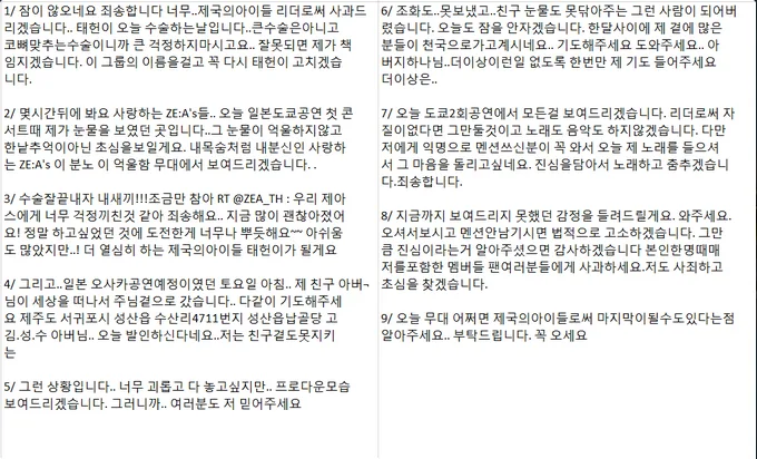 From September 14th to 15th, Lee Hoo started off by posting a series of tweets about his sudden emotional breakdown during ZE:A’s concert in Tokyo, Japan. Through his series of tweets, the leader apologised to his fans for causing unnecessary worry and explained that his emotions were deeply affected by Taehoon’s injury and the passing of his dad’s friend.