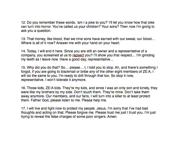 “What I want to say is that, through this recent incident, all the agency CEOs are aware of the fact that there is a lot of issues with the contracts. I will keep my mouth shut so I hope you will correct this and treat your artists better. Lastly, I respectfully request this from you. From the heart…if you really understand…