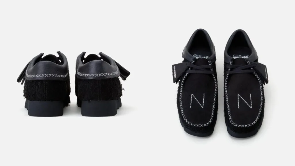 Starting off with the Wallabees: these classic shoes come in a solid black and have a cow suede vamp that adds a striking pop of colour and texture. The iconic footwear also features a rough-out leather upper with an uppercase “n” embroidered onto it.