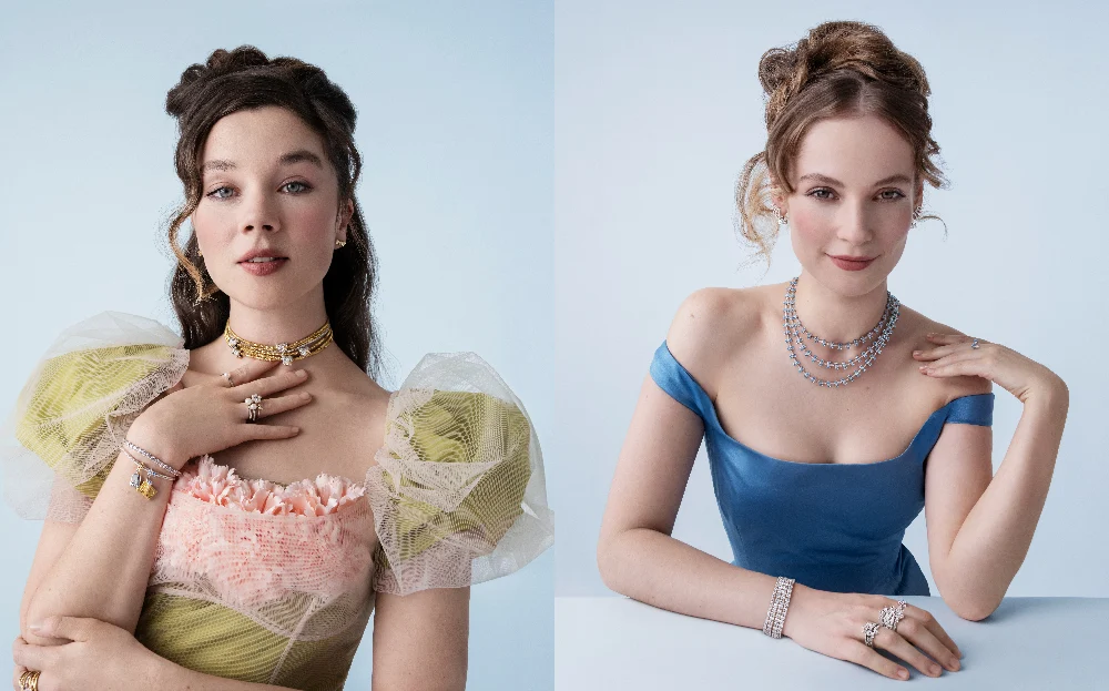 The on-screen siblings, Hannah Dodd, who plays Francesca Stirling, and Claudia Jessie, as Eloise Bridgerton, star in the campaign for the collaboration, in images styled by Harry Lambert and shot by fashion photographer Tim Walker.
