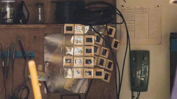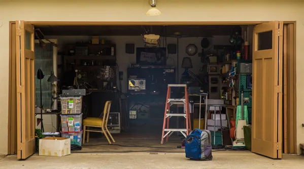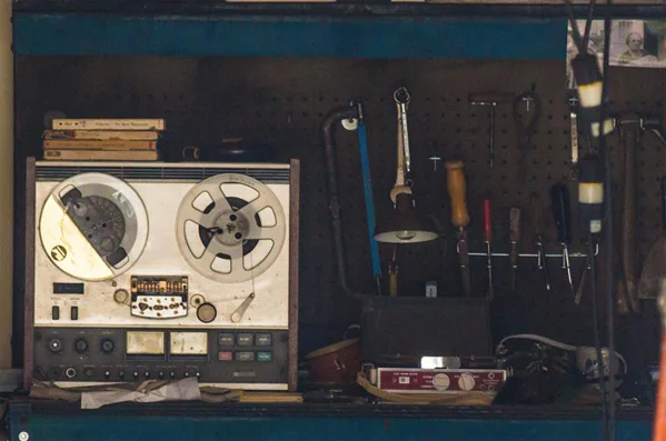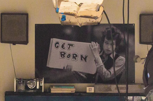 Cinderblock and wood shelves are pieced together along the walls. Roller skates, a Thermos, an old vacuum cleaner and 8-track player and stereo lay haphazardly about. An advertisement for a Braun electric coffee maker hangs on the wall, as does a poster featuring Bob Dylan holding a “Get Born” sign from a film clip featuring the song “Subterranean Homesick Blues”. And the house itself has been painted a beige colour with darker tan trim, contrasting with the formerly lighter exterior.