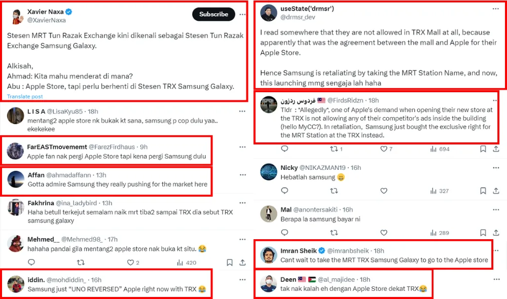 Many netizens have reacted to the official announcement of the TRX Samsung Galaxy station. Unsurprisingly, most joked about the move being Samsung’s way of getting back at The Exchange TRX for favouring its competitor. Some also joked that those wanting to head to the Apple Store in the mall will have to stop at a Samsung-branded station and be bombarded with tons of Samsung Galaxy advertisements before they can even enter the mall.