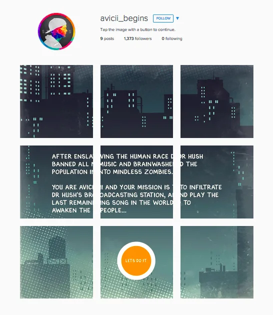 Determined to set a new trend, the innovative Instagram-based marketing campaign allows fans to click-through an interactive game and embark on their own story. It kicks off with an “Avicii Begins” Instagram account, with an introduction that reads as such: