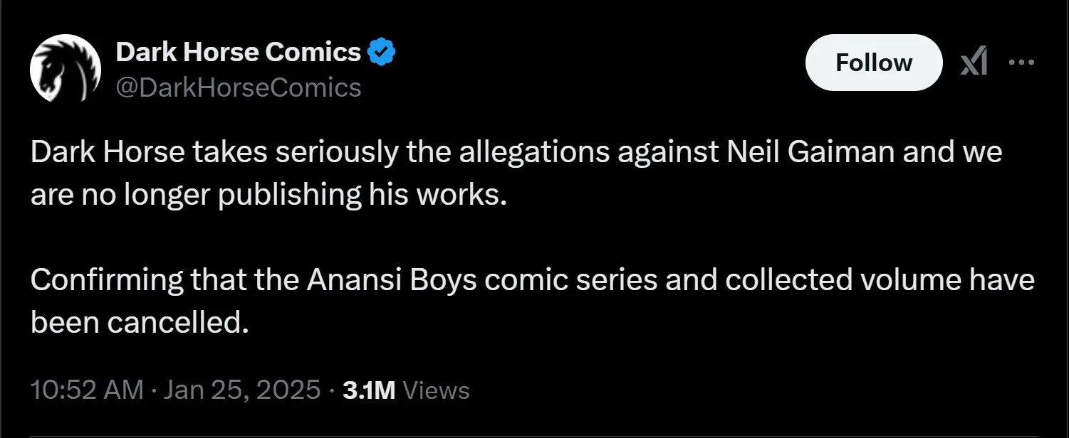 Ever since the news blew up, many more women have stepped forward and shared their experiences. Many companies have already cut ties with Gaiman, regardless of how long or deep their relationship was, the most significant of which was Dark Horse Comics. In a post on X, the American graphic novel publishing company stated that “Dark Horse takes seriously the allegations against Neil Gaiman, and we are no longer publishing his works.”