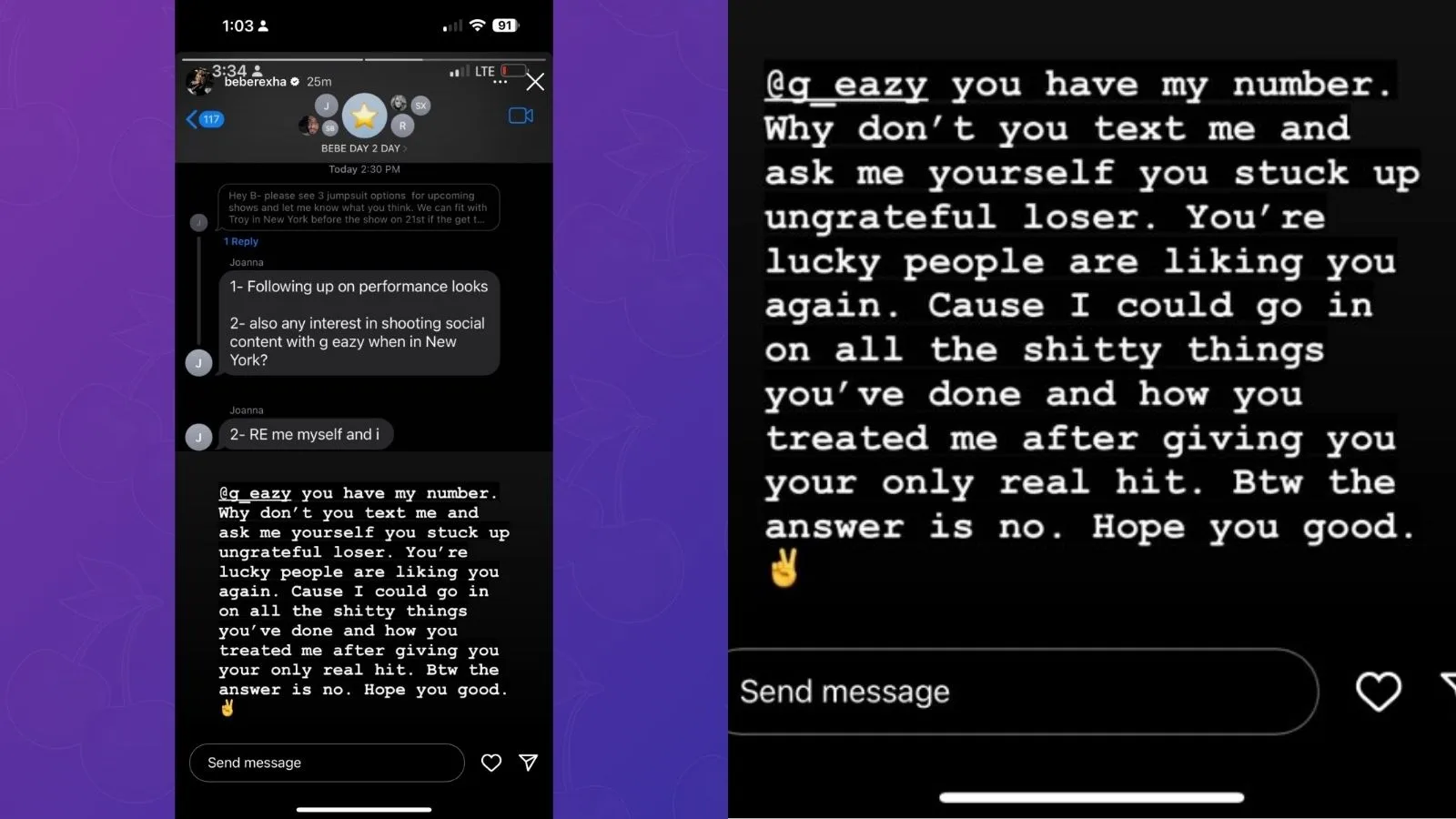 According to the now-deleted post, Bebe was asked by a staff member whether she would be keen on filming some content with the 35-year-old rapper. It seems like the answer was a hard no since Bebe then called G-Eazy a “stuck up ungrateful loser”, claiming that the “Tumblr Girls” rapper has her number and could have asked her himself. Of course, if that wasn’t enough to show how she felt, Bebe wrote at the end of her bash, “btw, the answer is no.”