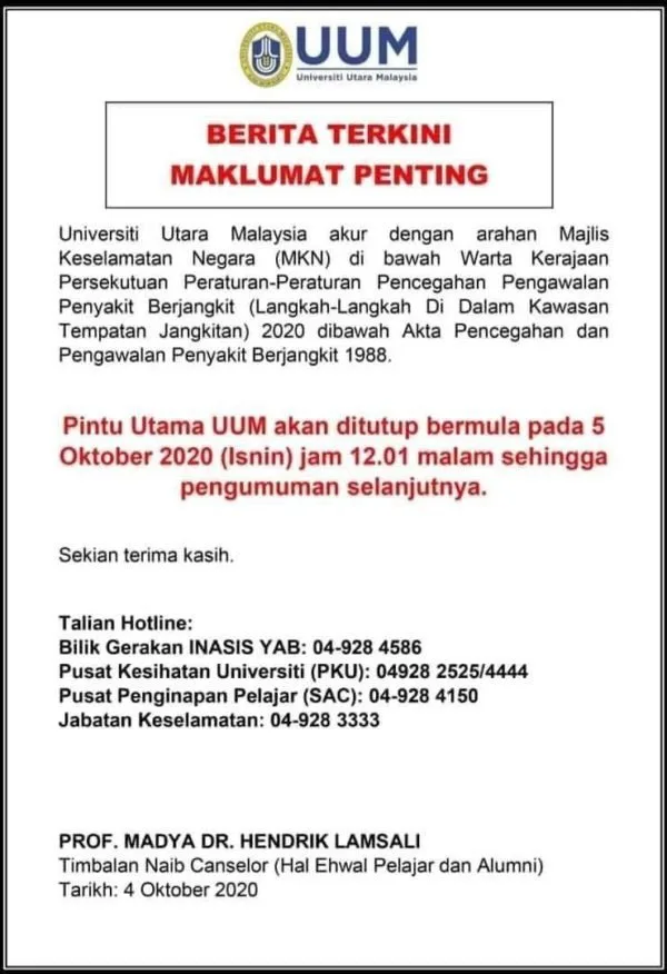 UUM Vice Chancellor, Prof Datuk Dr Ahmad Bashawir Abdul Ghani, stated that the university was taking the necessary precautions to control the spread of the virus by immediately suspending all activities and banning individuals from entering and leaving the campus premises.
