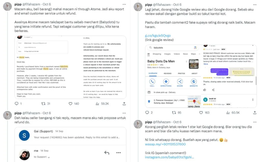 Shockingly, despite ignoring customers’ enquiries, Baby Dots posted about a closing down sale, which Fifa believes is a tactic to cheat more people. In hopes of getting her money back, the influencer lodged a report with the Tribunal for Consumer Claims and Atome, the financing app she used for her purchase. She also revealed that she left a review on Google, but the store had hidden it and added fake ones to increase their ratings.