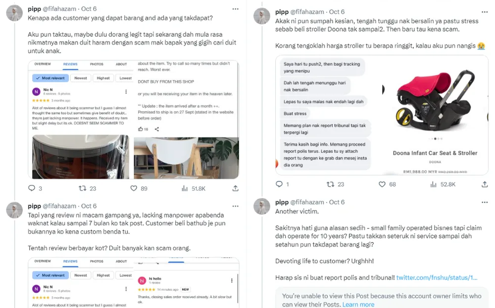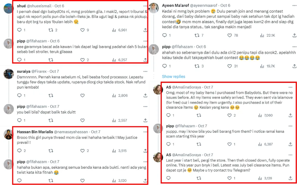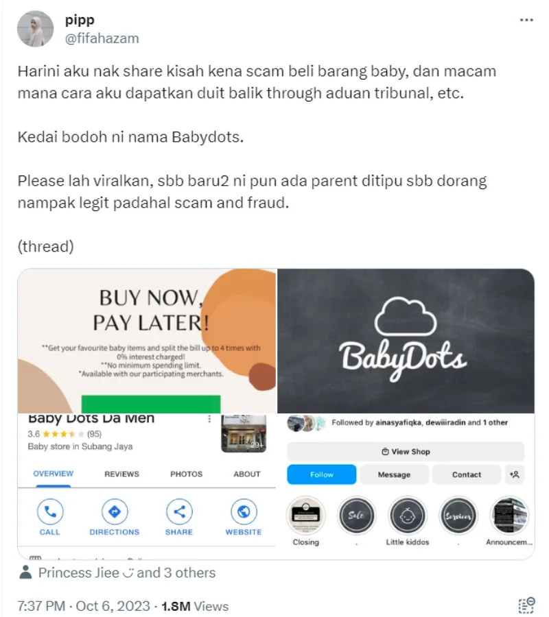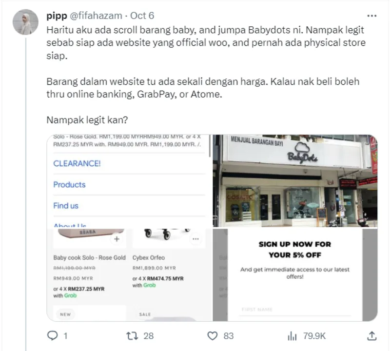 The mother, local content creator Afifah Azam, took to Twitter to detail her experience of getting scammed by a baby store called Baby Dots. In the Twitter thread, she shared more information about the store, their scams and how she filed a claim to get her money back. Afifah, also known as Fifa, said that she found the store while shopping online for baby items and believed them to be legit because it had a physical outlet in Subang Jaya.