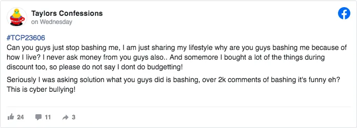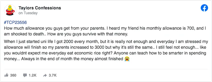 It was posted on Taylors Confessions Facebook Page this week, and it sparked an outrage from netizens, as many opine that much of money for a student is more than necessary.