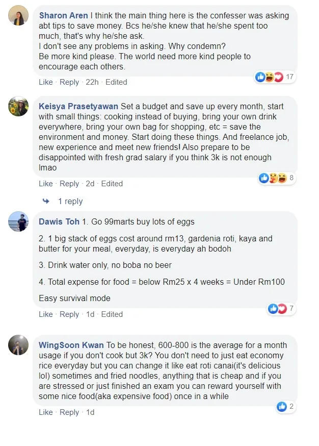 The original poster (OP) mentioned in the post that their parents had increased it to RM3,000 but the person insisted, “I still feel (the money is) not enough, like you wouldn’t expect me everyday (to) eat economic rice right?” He ended the post by asking readers on ways to be smarter in spending money.