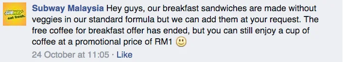 Subway Malaysia has confirmed that a new measure is being taken for their breakfast subs as their chefs have recommended the breakfast subs should be made without veggies. The brand responded to the customers that they can still opt to add veggies upon request and enjoy a cup of coffee at a promotional price of RM1.