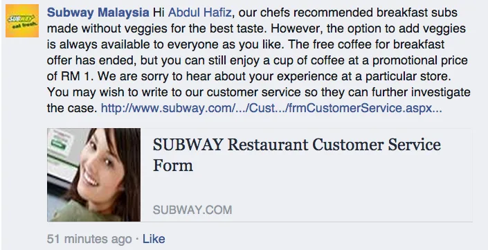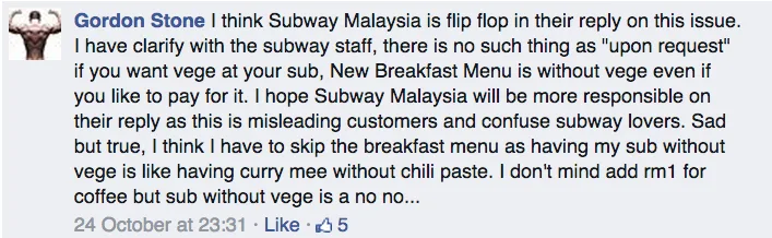 However, several customers have lashed out at Subway Malaysia as the employees have told them that there is no such thing as “upon request” and the veggies will still not added to the breakfast menu even if they want to pay for it.
