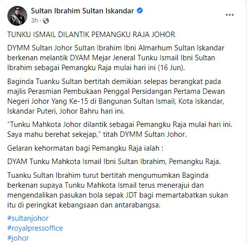 Tunku Sultan Ibrahim later confirmed TMJ’s appointment as regent on his official Facebook. Additionally, he expressed his wishes for his son to continue leading the JDT football team. “Tunku Sultan Ibrahim also said to announce His Majesty’s wish for Tunku Mahkota Ismail to continue to lead and manage the JDT football team to dignify the sport at the national and international levels,” the statement read.