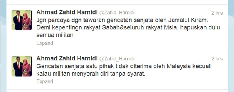 Which basically means, “A unilateral ceasefire is not accepted by Malaysia unless the militants surrender unconditionally. Don’t believe the ceasefire offer by Jamalul Kiram. In the interest of Sabahans and all Malaysians, wipe out all the militants first”.