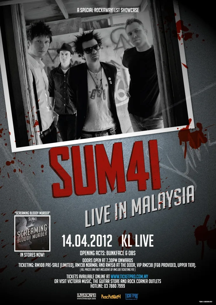 “We are very happy to finally bring Sum 41 to Malaysia. We were all disappointed when they couldn’t make it last year but from what I hear, they have re-vamped their show for this upcoming tour and fans can expect nothing short of intensity from them. Sum 41 is also ending their Screaming Bloody Murder world tour in KL and we hope all their fans come out to support them at this special Rockawayfest Showcase”, said Livescape’s director of LIVE events, Rahul Kukreja.