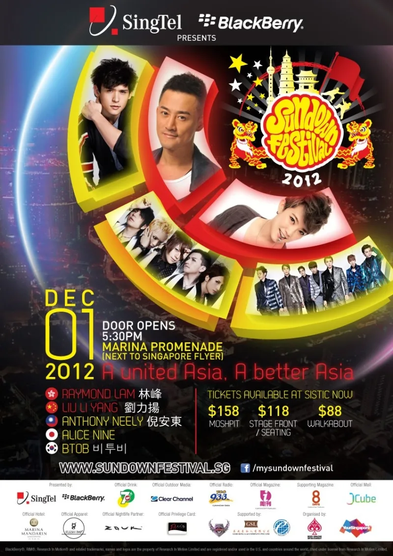 2012 marks the fourth anniversary for the homegrown Festival, which has emerged to become the definitive all-Asian music and cultural experience of the year. Sundown Festival 2012 is executive produced by Red Spade Entertainment, and is supported by the Singapore Tourism Board (STB) and presenting co-sponsor SingTel, Asia’s leading communications group, for the second consecutive year. Global wireless innovation leader, BlackBerry, is this year’s newest sponsor to come onboard.