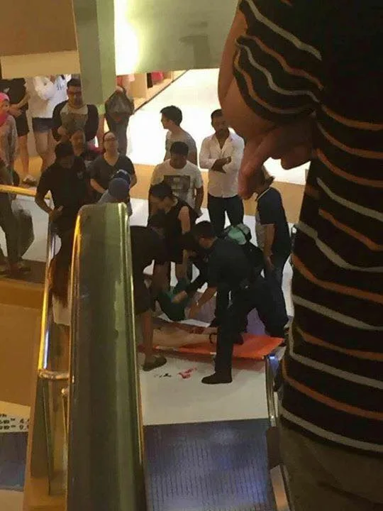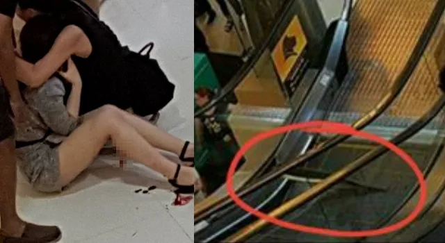 Andrine Yoon took to Facebook to share the incident. According to her caption, the metal piece on the side of the escalator suddenly popped out while the shopper was riding on it. In a photo, the victim is seen bleeding heavily, with a piece flesh hanging off of her calf. As at time of writing, the post has been shared over 26,000 times.
