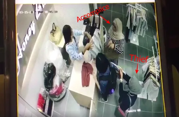 After checking the CCTV, the victims found out that their phones were looted by a woman who is wearing a black shirt and a grey tudung (see picture above). Elaine also pointed out that the other tudung-clad woman in the shop is the pickpocket’s accomplice.