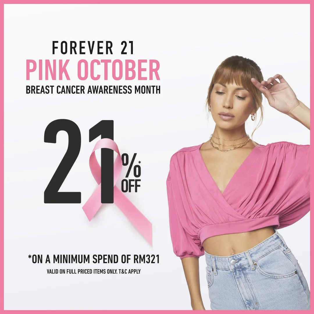 Celebrate this purposeful month with an all-pink outfit from Forever 21. It’s the simplest way to express moral support for those affected by breast cancer. Shop your pink outfit now at Forever 21 and enjoy 21% off when you purchase a minimum of RM321.