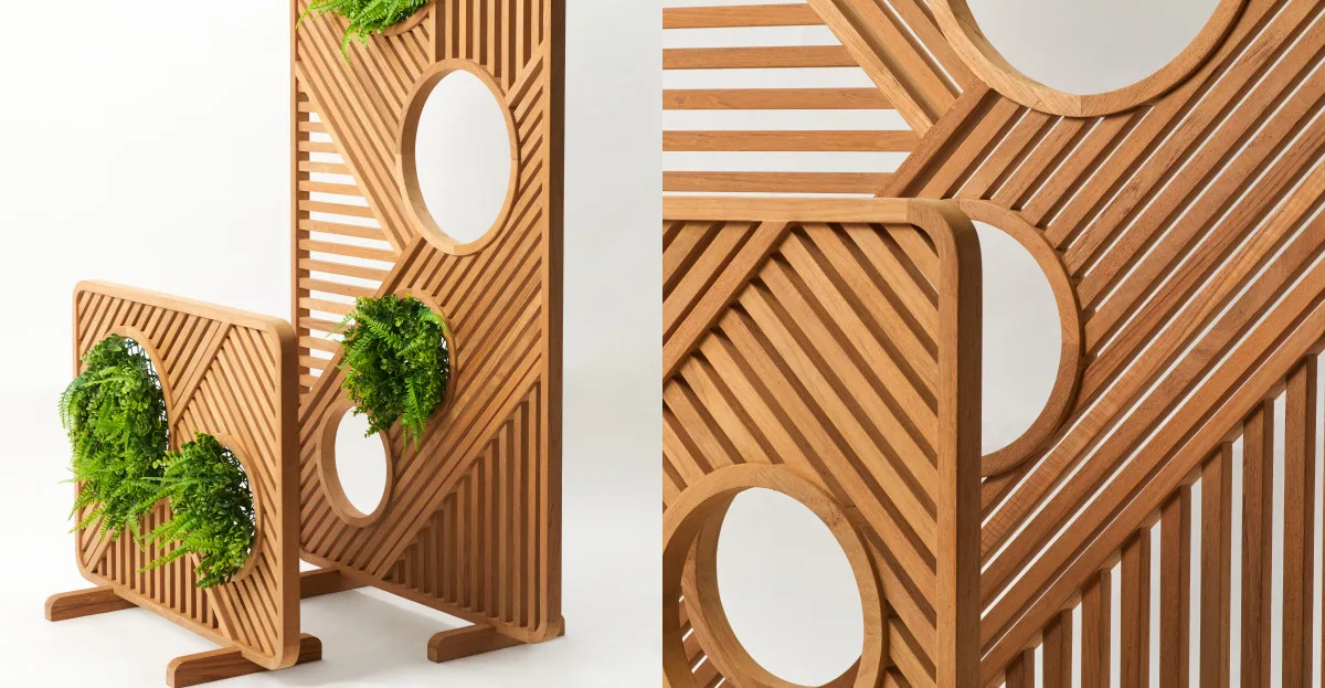 The wooden tables and partitions in this collection are made of natural teakwood, which reduces the need for conservation processing, as can be seen above from their T-T Table / Green Partition Collection. In order to create an artistic and sustainable workpiece, they choose wood pieces that are similar in size.