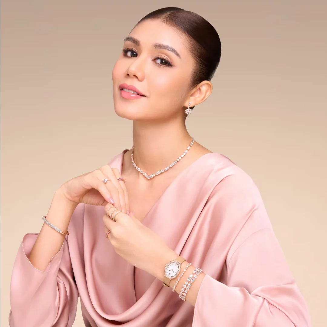 Sharifah Rose, on the other hand, is seen wearing a curated selection of rhodium‑plated designs. The new Una Angelic strandage necklaces are complemented by the iconic Constella pendant and its signature dancing stone. Her wrist styling features the classic Matrix Tennis bracelet alongside the Constella bracelet. Sculptural statement rings, including the Hyperbola and heart-shaped Una designs add expressive sparkle. As a finishing touch, she pairs her ensemble with the Matrix brooch.