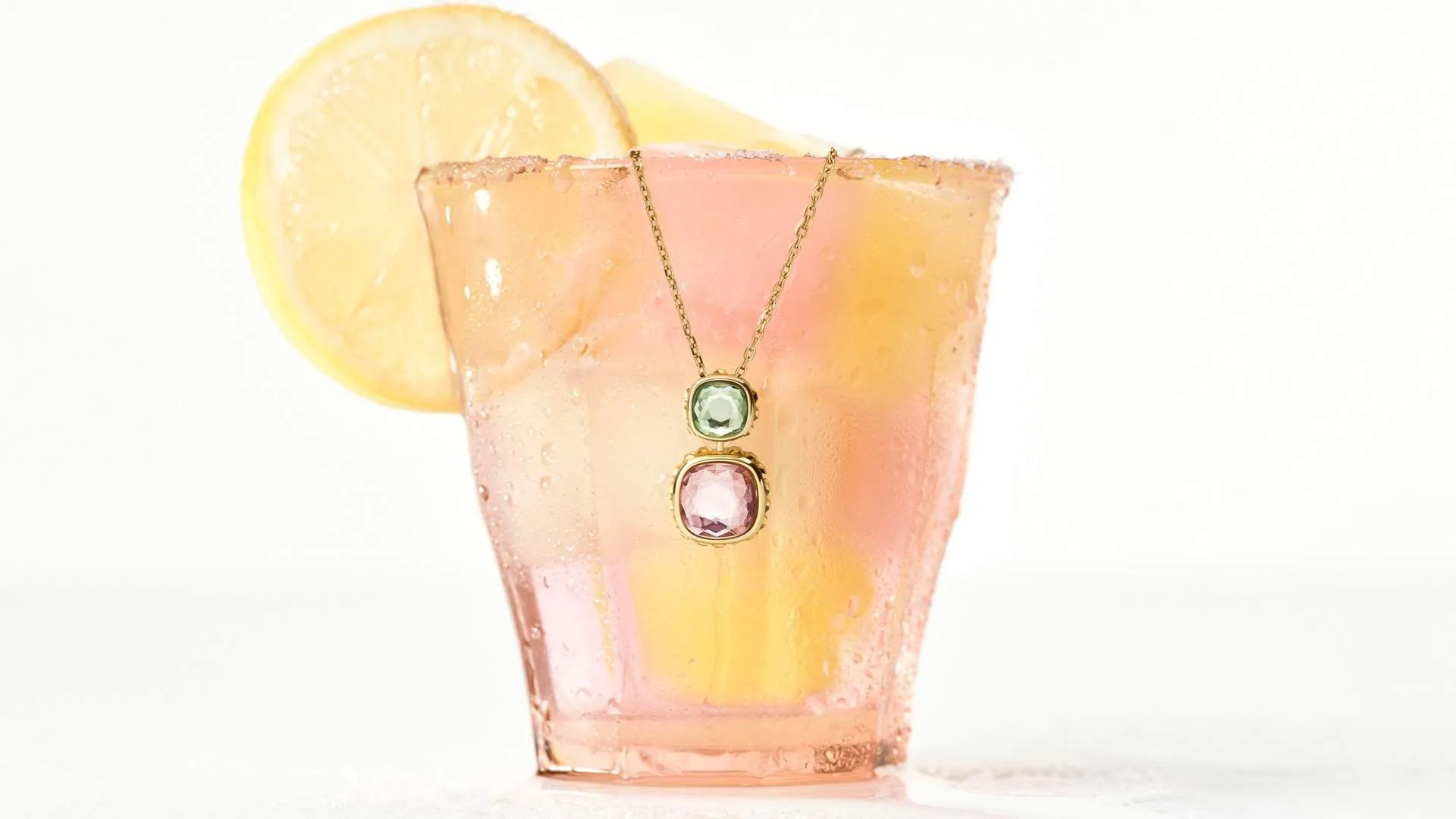 - A rotating bezel set pendant features a Swarovski ReCreated™ Crystal* in blue on one side and pink on the other, to increase the versatility of the jewel. The design is trimmed with jonquil ReCreated™ Crystals.