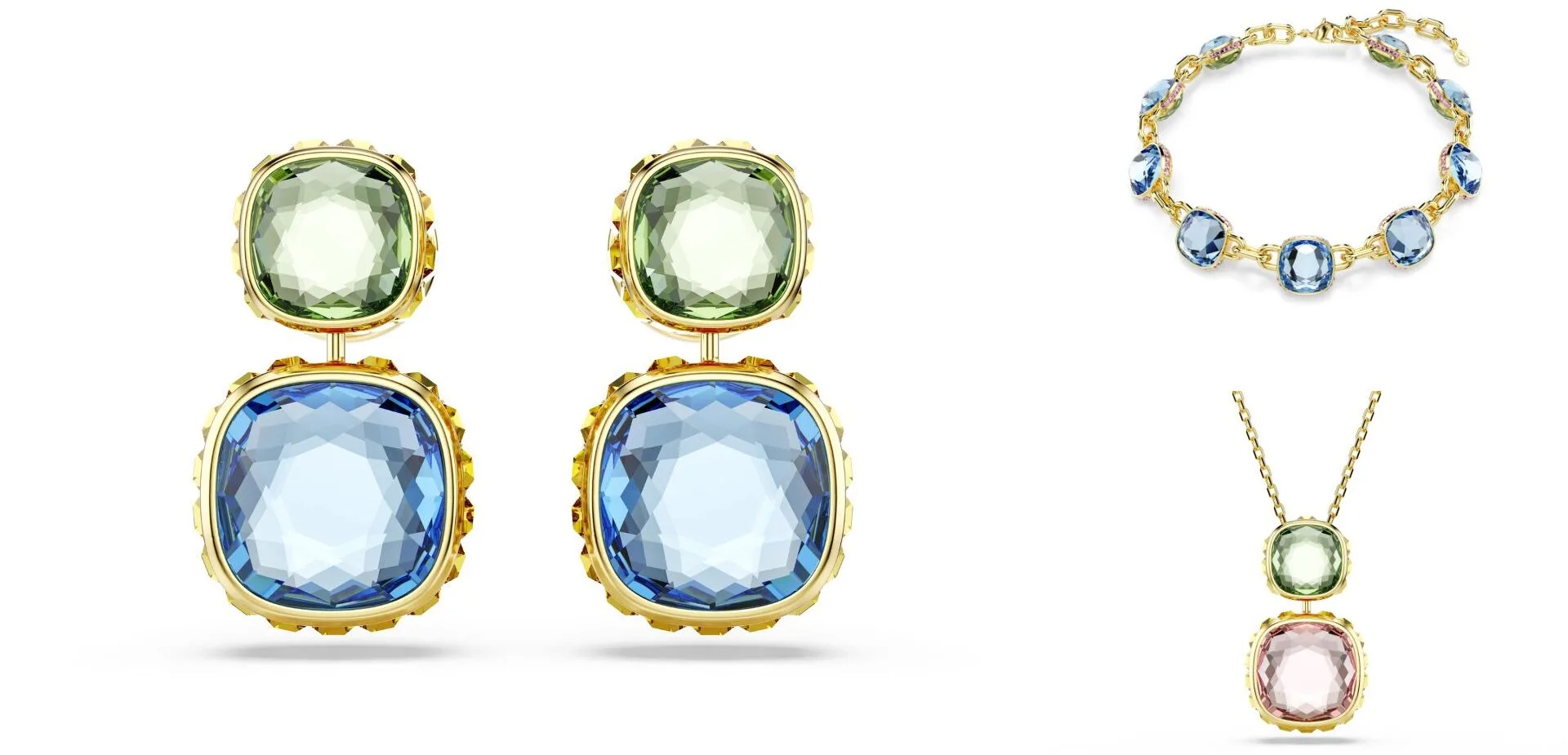 The six all-new designs feature lower-impact materials, such as Swarovski ReCreated™ Crystals and metals from recycled sources*, and have been thoughtfully crafted to switch crystal colours and adapt styles for increased longevity of wear and timeless versatility. The Chroma Twist Collection includes: