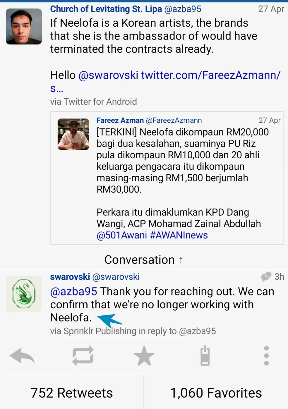 The male netizen’s tweet had since gone viral, with over 5.3k retweets at the time of writing (Friday, 30th April). Refusing to stay silent about it, Swarovski then left a reply that read, “Thank you for reaching out. We can confirm that we’re no longer working with Neelofa.”