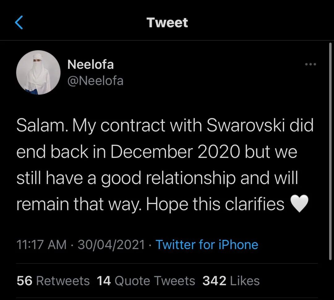 Not long after the news about her alleged “termination” came to light, Neelofa has personally confirmed that she’s no longer an ambassador for Swarovski. The “Kau Yang Terindah” actress wrote on her Twitter, “Salam. My contract with Swarovski did end back in December 2020, but we still have a good relationship and will remain that way. Hope this clarified.”