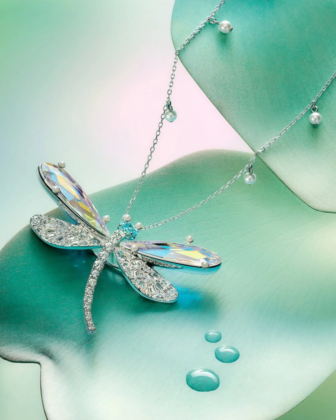 Interpretations of dragonflies and flowers, both literal and abstract, come together in a fun, sparkly celebration of nature. Rainbow-hued stones shine alongside delicate crystal pearls, embellished in an array of cuts and mixed metals, while crystal butterflies adorn brooches, hair accessories, and figurines.