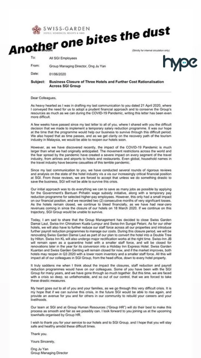 Group Managing Director Ong Ju Yan issued a memorandum announcing the closure of 3 hotels around Malaysia and also updates on remaining properties moving forward.