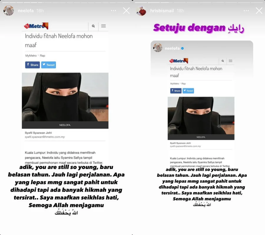 Meanwhile, Neelofa’s IG Story post was also shared by PU Riz on his social media page. In this case, he also opted to forgive the girl. In an interview with Harian Metro, he explained that the family accepted her apology after believing that the girl had already repented.