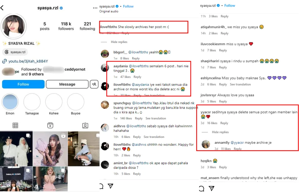 Prior to the marriage revelation, fans noticed that the singer had been slowly removing every post of herself with DOLLA on her Instagram. As seen in the screenshots above, the only photos remaining were sponsored posts. This obviously got fans worried and wondered if there was any conflict between the once-quartet but since Syasya replied to her DOLLA’s comments on her latest photos, it can be assumed that it’s all good between them.