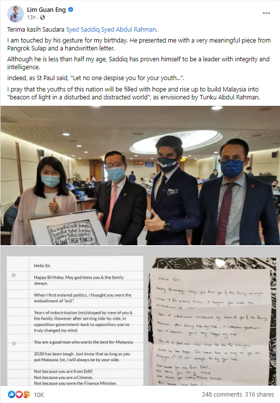 The best part about Syed Saddiq’s gift to Lim Guan Eng is definitely the birthday-wish handwritten note that he personally wrote for the DAP politician. The usage of words in the note is indeed very moving, even if it was read from a third’s person perspective.