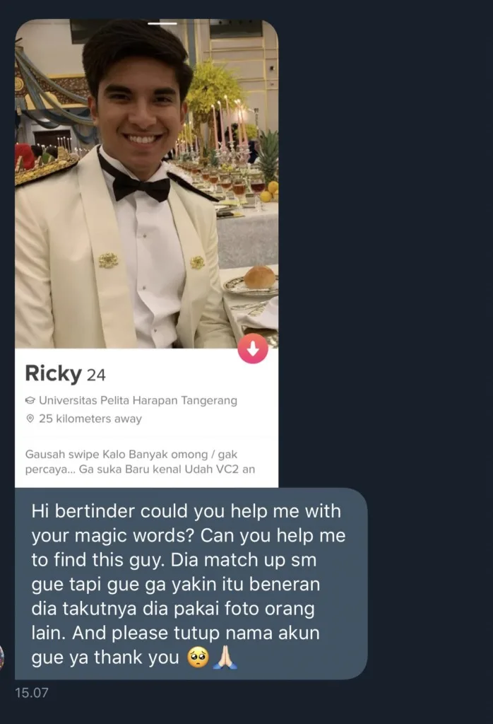 “Hi @bertinder, can you help me find this guy? He matches with me but I doubt that this is the real him and he just used someone else’s picture. And please censor my username, thank you,” the concerned lady wrote in the chat.