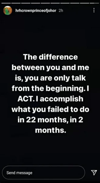 Syed Saddiq’s post also managed to catch Tunku Mahkota Johor (TMJ) Tunku Ismail Idris’ attention. The Crown Prince of Johor contributed a generous amount of RM300k to the people of Muar. However, there seems to be some kind of a “bad blood” between the two public figures, as seen in the latter’s Instagram Stories updates.