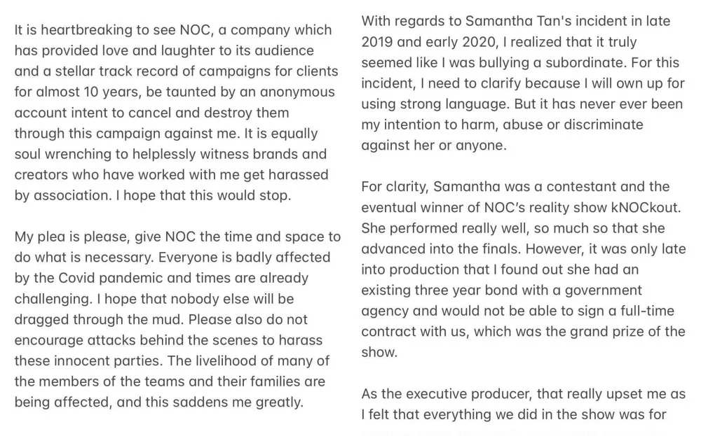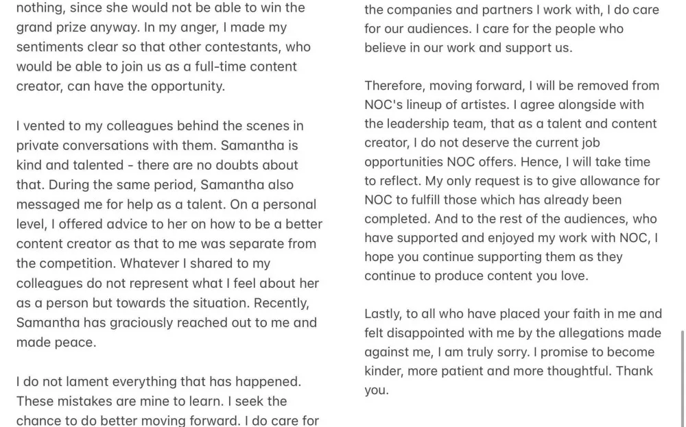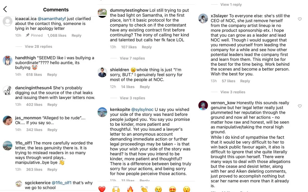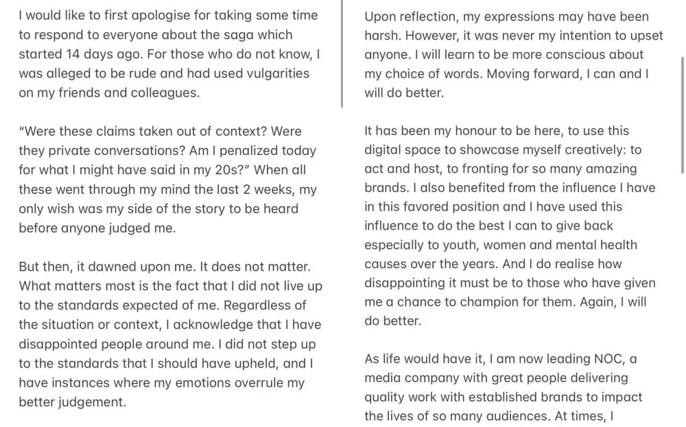 Following NOC’s lawyer letter to anonymous Instagram account @sgcickenrice, Sylvia posted a lengthy apology while acknowledging some of her shortcomings and feeling ashamed over what had transpired.