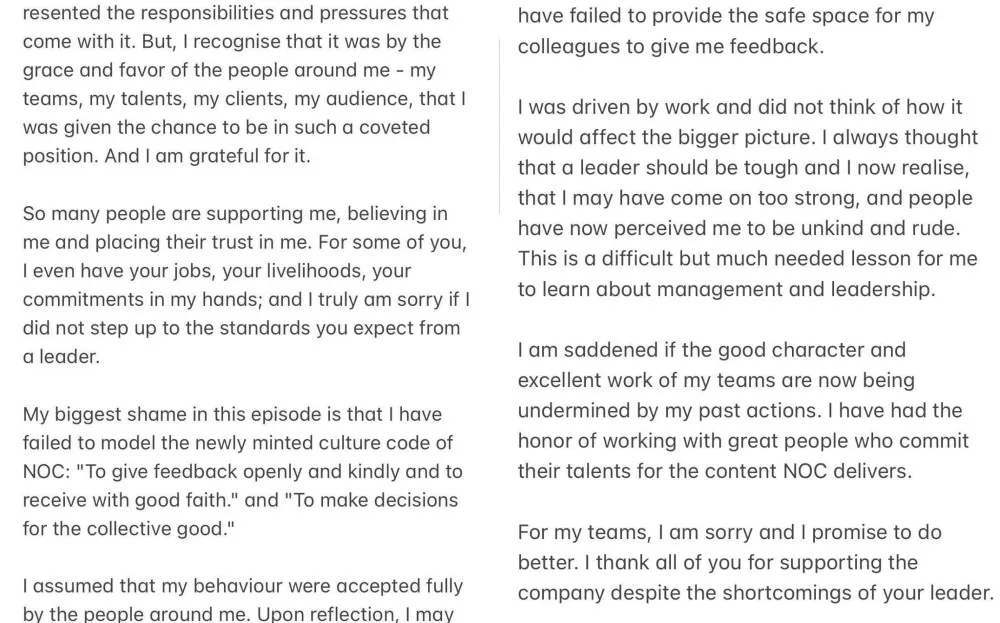In her statement, Sylvia admitted there have been instances where her emotions got the better of her, which in hindsight, painted her as unkind and rude. “My expressions may have been harsh. However, it was never my intention to upset anyone. I will learn to be more conscious about my choice of words. Moving forward, I can and I will do better,” she said. “I assumed that my behaviour were [sic] accepted fully by the people around me. Upon reflection, I may have failed to provide the safe space for my colleagues to give me feedback.”