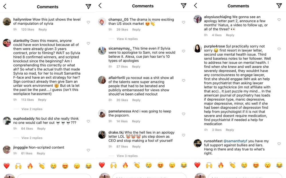 Samantha debunked Sylvia’s claims, explaining all 8 contestants had allegedly signed a 3-year talent contract before the reality series started filming. According to her, NOC’s lawyers had already reviewed her contract to ensure that the 2 contracts did not overlap. Apparently, all 8 of them were “granted the grand prize before filming began”.
