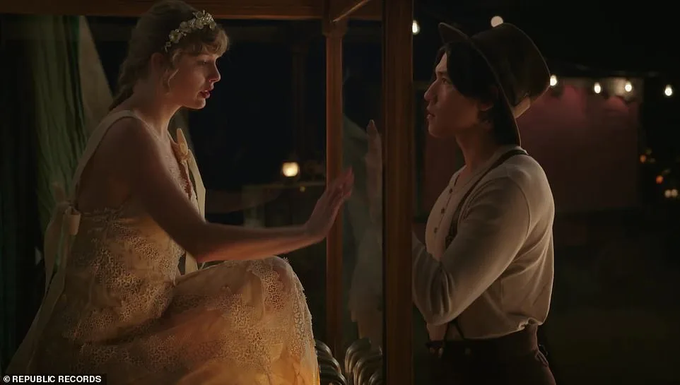 In the whimsical visual, we see Taylor following a gold string into her piano. It leads her to the man of her dreams. That Korean American man is played by Taeok Lee. He first appears as a reflection in a puddle of water and later reappears again in front of the pop star while she’s stuck inside a glass cage.