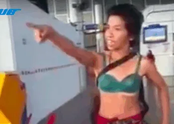 A video of a woman in a green bra and pink pants attacking and arguing with a man at the KTM ...