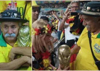 During the semi-final World Cup match between Brazil and Germany, the television camera caught this old Brazilian man who clung ...