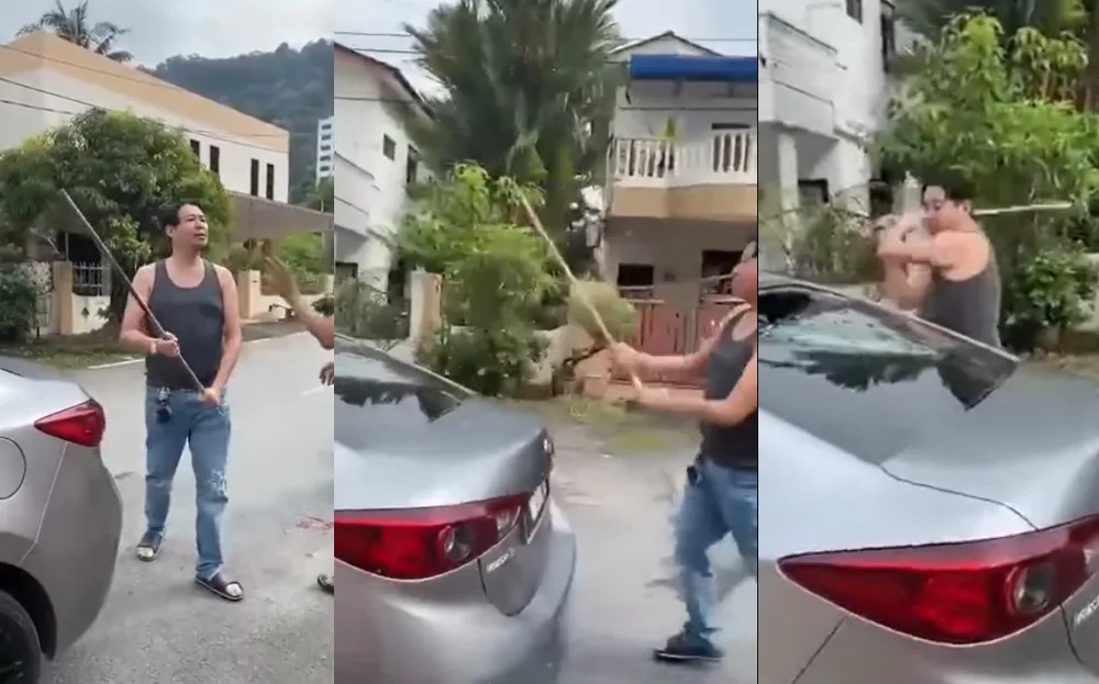 Videos showing different perspectives of the incident was uploaded on 26th January to Facebook group Inforoadblock. According to Harian Metro, the incident had taken place at the Crystal Greek Residence in Taiping, Perak. One video showed a man holding a sturdy stick walking up to a group. He threatened to hit them with said stick. When told he couldn’t do such a thing, he retaliated with: “You people (hit my dog) and beat up my dad.” A lady shrilly told him they could negotiate over it, but he refused and took his anger out on the car. He smashed the rear windshield and whacked the side of the vehicle a few times.