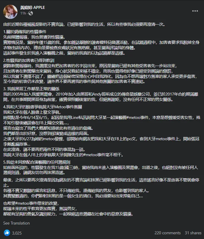 Yesterday (3th July 2023), Taiwanese artist Apple Huang (黄暐婷) posted on Facebook, clarifying that she does not have an improper relationship with Blackie. She then went on to share a traumatic experience from 25 years ago when she was sexually harassed by a celebrity. What’s more is that this perpetrator is someone who is currently involved in the #MeToo scandals!