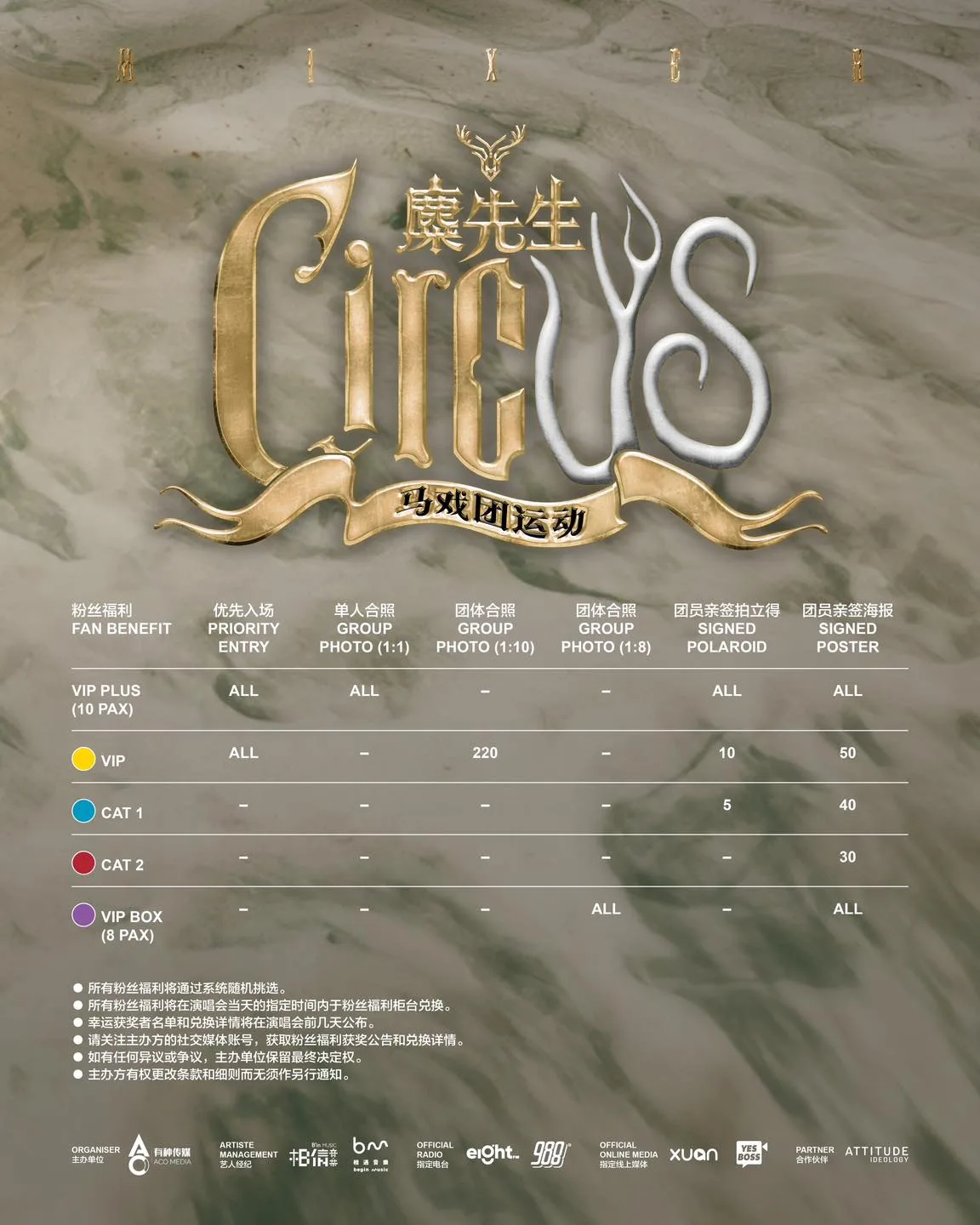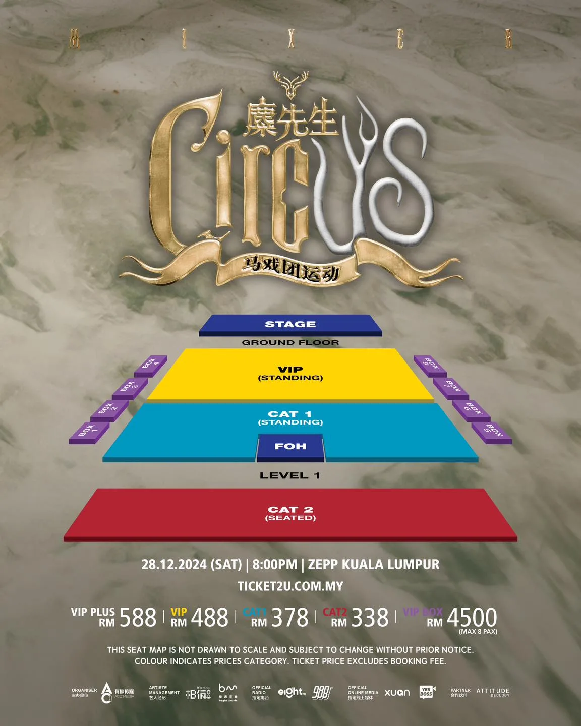 - Ticket Prices: VIP PLUS: RM588, VIP: RM488, CAT1: RM378, CAT2: RM338, VIP BOX: RM4,500 (for 8 pax)