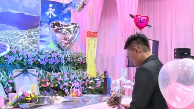 The funeral, which took place at Changhua City Funeral & Cemeteries Service, was decorated into a wedding venue. The parlour had a pink backdrop and was filled with heart-shaped balloons, beautiful flowers, and large sign that declared, “We are engaged”. The Taiwanese man, who is a truck driver surnamed Tsai (蔡尚振), even wore a business suit like a bridegroom.