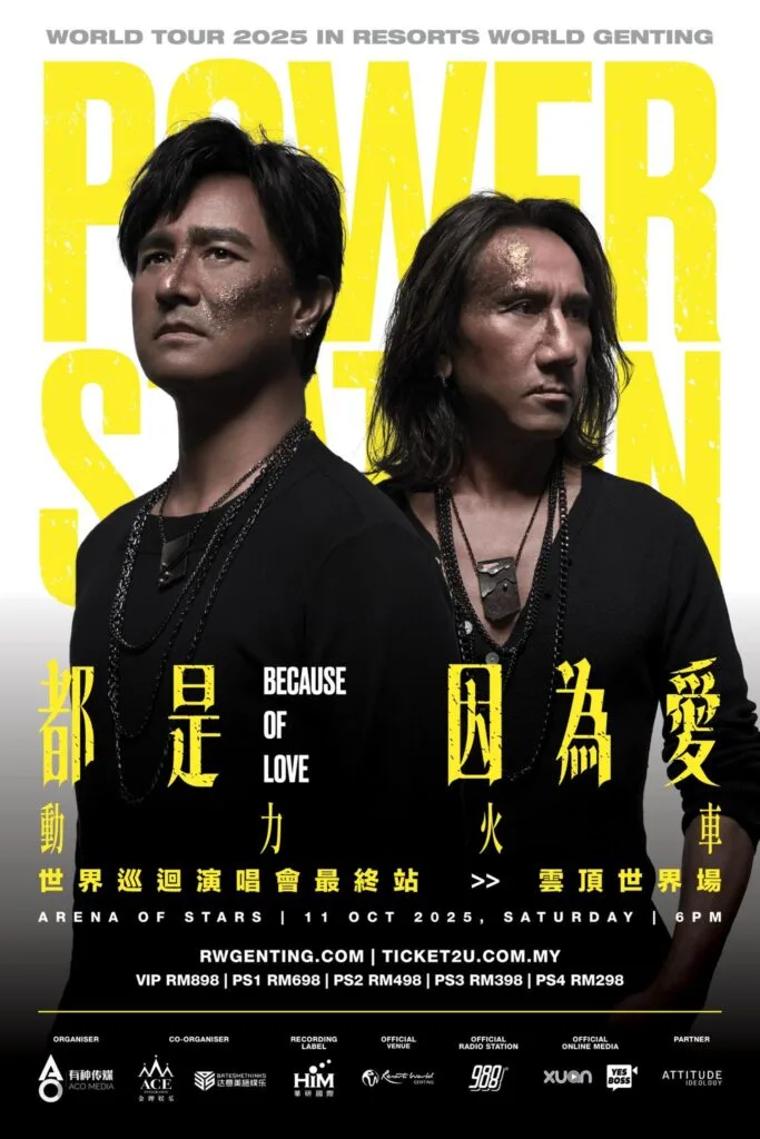Concert organiser ACO Media recently unveiled details of Power Station’s “Because Of Love World Tour in Kuala Lumpur”. The rock duo will perform at Arena Of Stars, Resorts World Genting on 11th October 2025 (Saturday). The seating plan is now available, and tickets will go on sale via rwgenting.com and Ticket2U from 7th July 2025 (Monday) onwards.