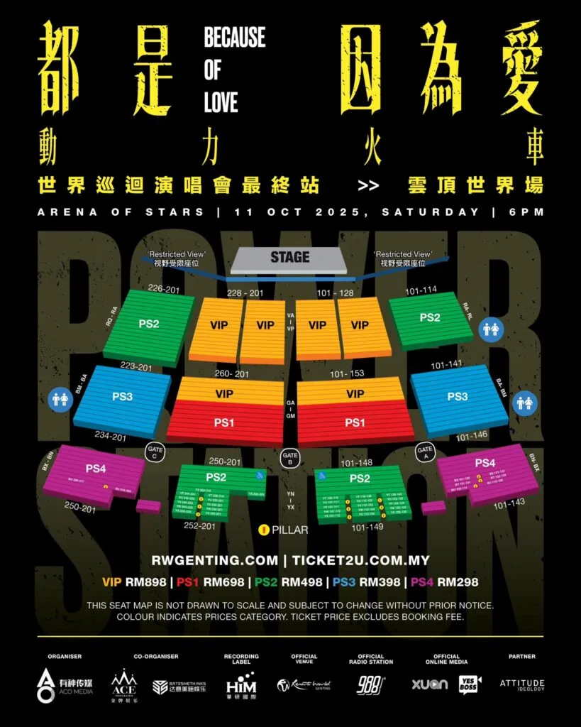 • Ticket Prices: VIP: RM898, PS1: RM698, PS2: RM498, PS3: RM398, PS4: RM298