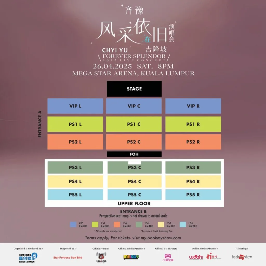 - Ticket Prices: VIP: RM788, PS1: RM688, PS2: RM588, PS3: RM488, PS4: RM388, PS5: RM288